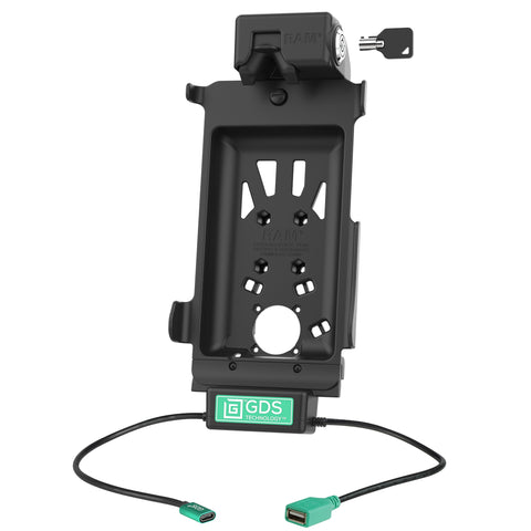 - Spring-loaded key-locking vehicle dock featuring GDS® Technology™ uses an integrated pogo pin connector to provide charging and connection to one additional USB peripheral