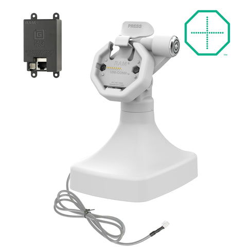 The GDS Uni-Conn Powered Locking Tilt & Swivel Dock with PoE - Gray (RAM-GDS-DOCKLR-D14-U3E-GRY) is a free-standing, powered dock for devices enclosed in an IntelliSkin Thin-Case with Rear Pogo Pads. This solution can swivel 180 degrees and allows devices to tilt 180 degrees, ideal for customer-centric industries like retail, hospitality, food service, and more. Easily dock and undock your device with the assistance of the mechanical attachment mechanism. Power over Ethernet (PoE) is provided to the pogo pins integrated into the GDS Uni-Conn adapter via RJ45 connection. This dock features a weighted base and rubber pads that offer theft deterrence and prevent it from sliding around on surfaces. Keep your device safe in high-traffic environments with the key lock, integrated to provide additional theft deterrence. The light gray aesthetic is ideal for sophisticated, bright workplaces. One Dock to Connect Them All Always Protected. Always Connected.