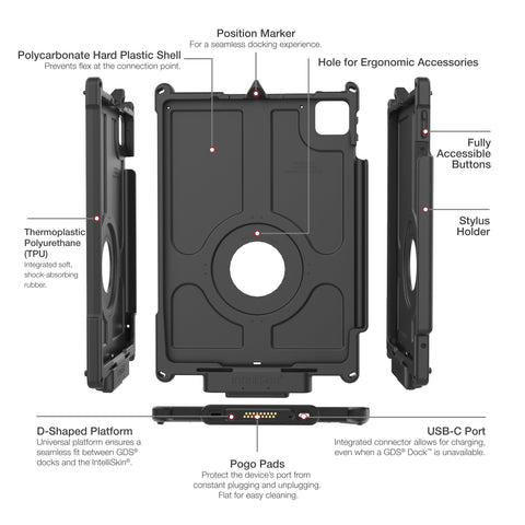 The IntelliSkin Next Generation for the Apple iPad Pro 11" (M4) (RAM-GDS-SKIN-AP46-NG) is a protective sleeve that combines a hard plastic shell with soft, shock-absorbing rubber. It features an integrated GDS connector molded directly into the skin that prevents damage to your devices charging port from repetitive docking. The flat, ruggedized contacts on the connector collect less dirt and are easier to clean. The integrated connector also has a USB Type-C port that bypasses the pogo pads to charge the device when you dont have a GDS Dock available. It comes with a protective cap for the USB-C port, ensuring debris does not build up over time in field applications. This sleeve provides military-grade drop protection and is compatible with a variety of GDS Docks and accessories. Always Protected. Always Connected.