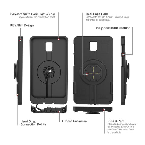 The IntelliSkin Thin-Case for Tab Active5 & 3 with Rear Pogo Pads (RAM-GDS-SKIN-SAM93-TCB) is a low-profile, two-piece device enclosure designed for the GDS Uni-Conn docking platform. The GDS connection style integrates a USB-C connector that routes through the case to the pogo pads integrated into the GDS Uni-Conn adapter. The robust polycarbonate shell protects your device from daily wear and tear while the complete enclosure makes it difficult for unauthorized users to access the tablet, providing additional peace of mind for tablets mounted in high-traffic environments. The flat, ruggedized pogo pad contacts are made for repetitive docking to protect the device's USB-C port and collect less dirt making them easier to clean. An integrated USB Type-C connector at the bottom of the case allows for device charging even when you dont have a GDS Powered Uni-Conn Dock available. The IntelliSkin Thin-Case with Rear Pogo Pads for the Samsung Tab Active5 & 3 is only compatible with GDS Powered Uni-Conn docks, easily identified by the GDS Powered Uni-Conn Adapter emblem. One Dock to Connect Them All. Always Protected. Always Connected.