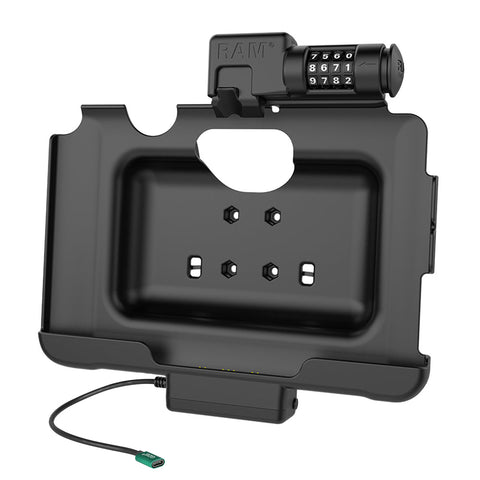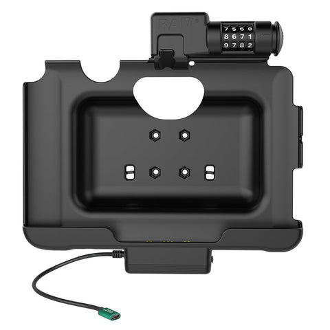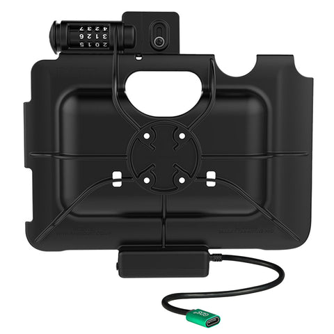 This powered cradle for the Samsung Galaxy Tab Active4 Pro and Tab Active Pro has been designed to meet the demands of field workers in a variety of applications including transportation, field sales, logistics, manufacturing, and much more. Power capabilities are provided to the device through pogo pins, and you can easily rotate the device for use in portrait or landscape mode. For security and theft deterrence, this powered cradle features a combination lock that’s compatible with the RAM® Skin™ or factory device skin, as well as GDS® Hand-Stand™ and shoulder strap accessories. Access to the stylus remains while the device is docked. Included is a set of four nuts and bolts to connect the cradle to any RAM® components containing the universal AMPS hole pattern.