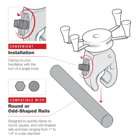 • Includes a medium version of the RAM® Tough-Claw™ base, designed to clamp to round, square, and odd-shaped rails and bars ranging from 1" to 1.6" in outer diameter; rubber pads provide stable gripping and protection of mounting surface