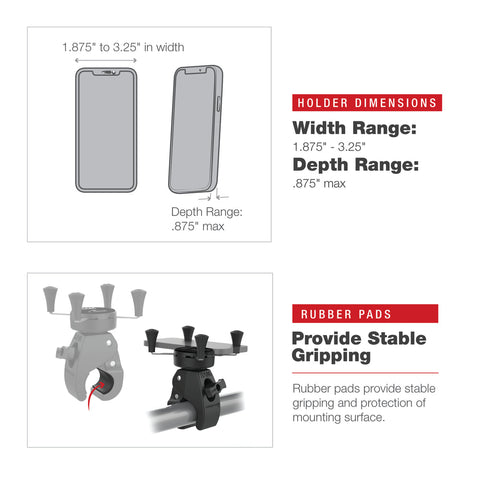 The RAM® X-Grip® Phone Mount with Low-Profile RAM® Tough-Claw™ (RAM-HOL-UN7-404-2U) consists of the medium RAM® Tough-Claw™ base and universal RAM® X-Grip® phone holder, connected by the RAM® Pin-Lock™ adapter. The RAM® X-Grip® features an ‘X’ design that expands and contracts to secure your phone and includes a device tether recommended for outdoor applications. With the RAM® Tough-Claw™ base connected, easily attach the RAM® X-Grip® on round, square, and odd-shaped rails and bars ranging from 1" to 1.6" in outer diameter. This kit is compatible with handheld devices that will fit the dimensions listed below. It is important to verify the dimensions of your handheld device with its case, sleeve, or skin when determining the overall size.
